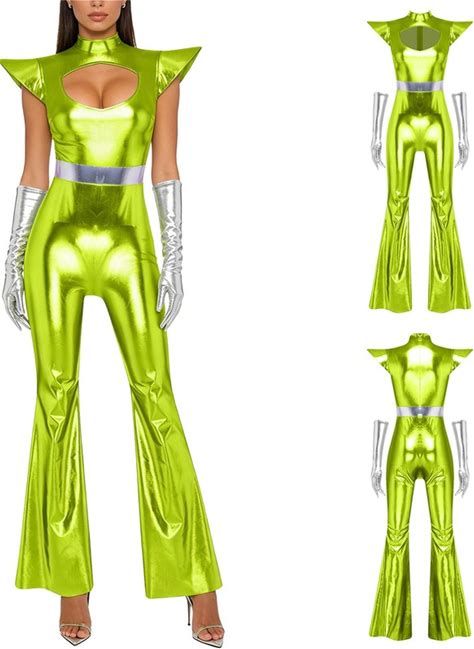 Womens Alien Cosplay Metallic Shiny Jumpsuit With Gloves For Halloween